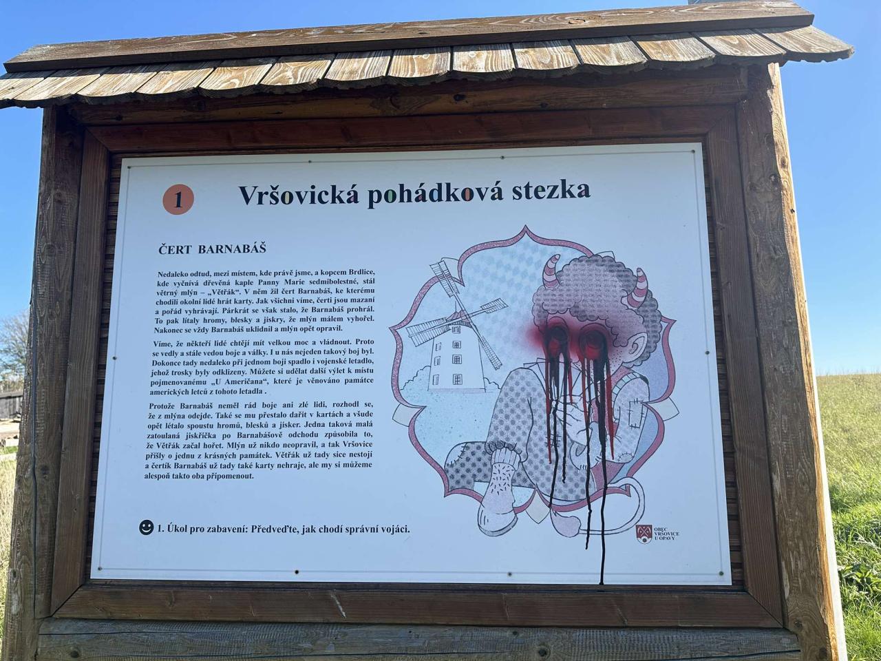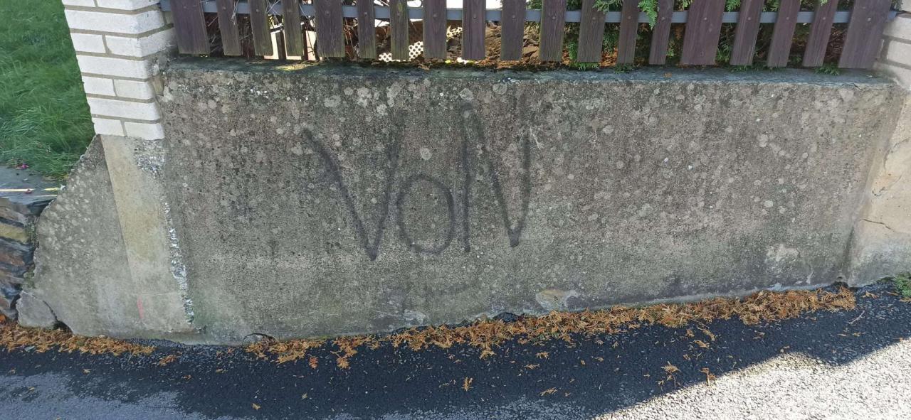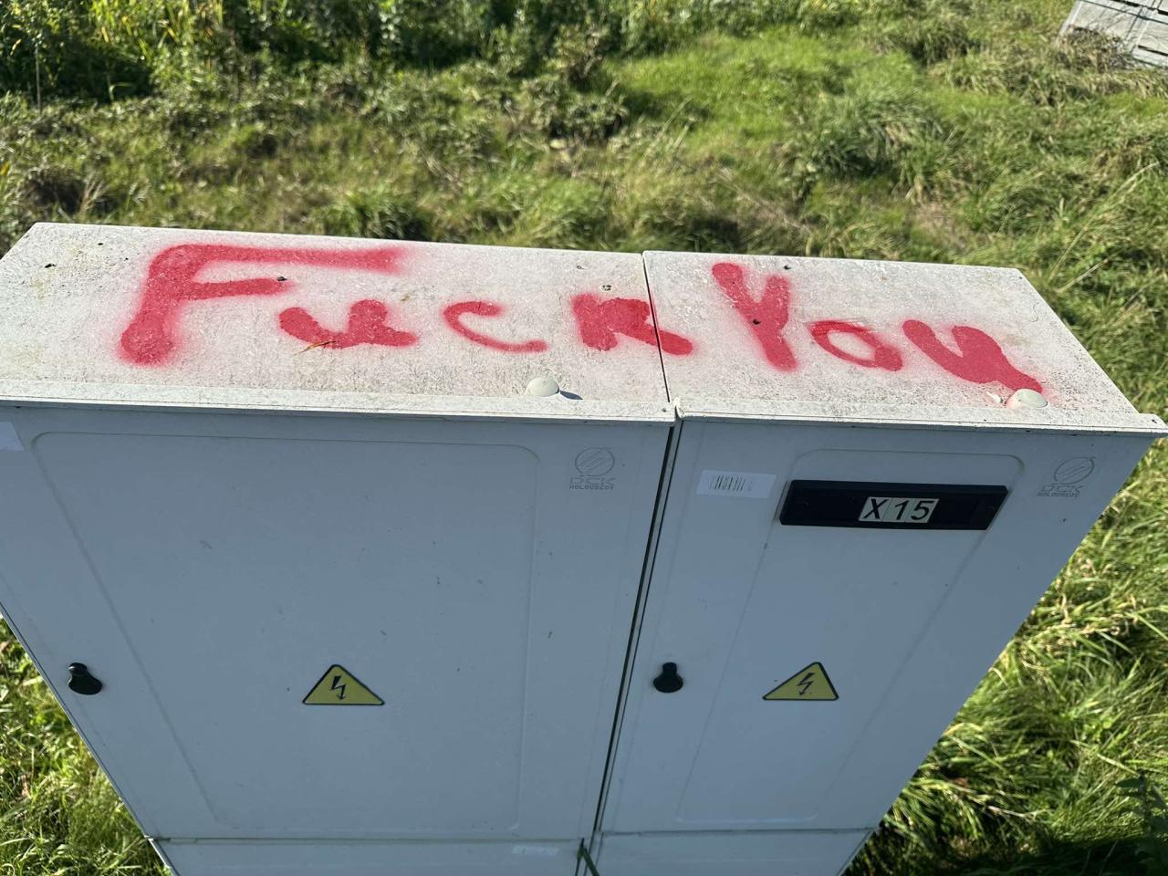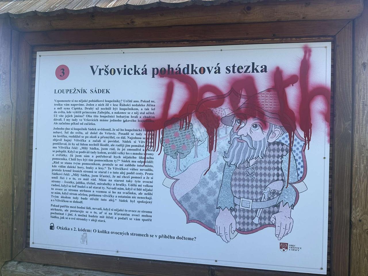 1. října jsme Vás informovali o tom, že neznámý pachatel poškodil 2 kříže v extravilánu obce. Dnes jsme zjistili skutečnost, že nám někdo sprejem poničil 2 cedule pohádkové stezky směrem k hájence, vulgarizmem poničil el. rozvaděč občana, zídky, fasádu, značku na "staračce".